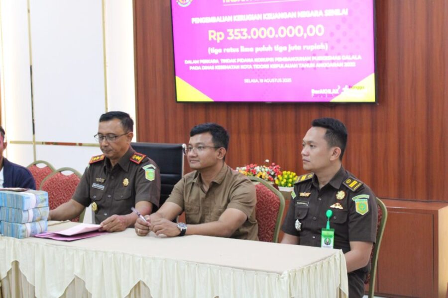 TIDORE – Kejaksaan Negeri Tidore Kepulauan Kembali menerima pengembalian kerugian negara sebesar Rp. 353.000.000,- (tiga ratus lima puluh tiga juta rupiah) dalam Perkara Tindak Pidana Korupsi Pekerjaan Pembangunan Puskesmas Galala pada Dinas Kesehatan Kota Tidore Kepulauan Tahun Anggaran 2022. Selasa (19/08/2025).
